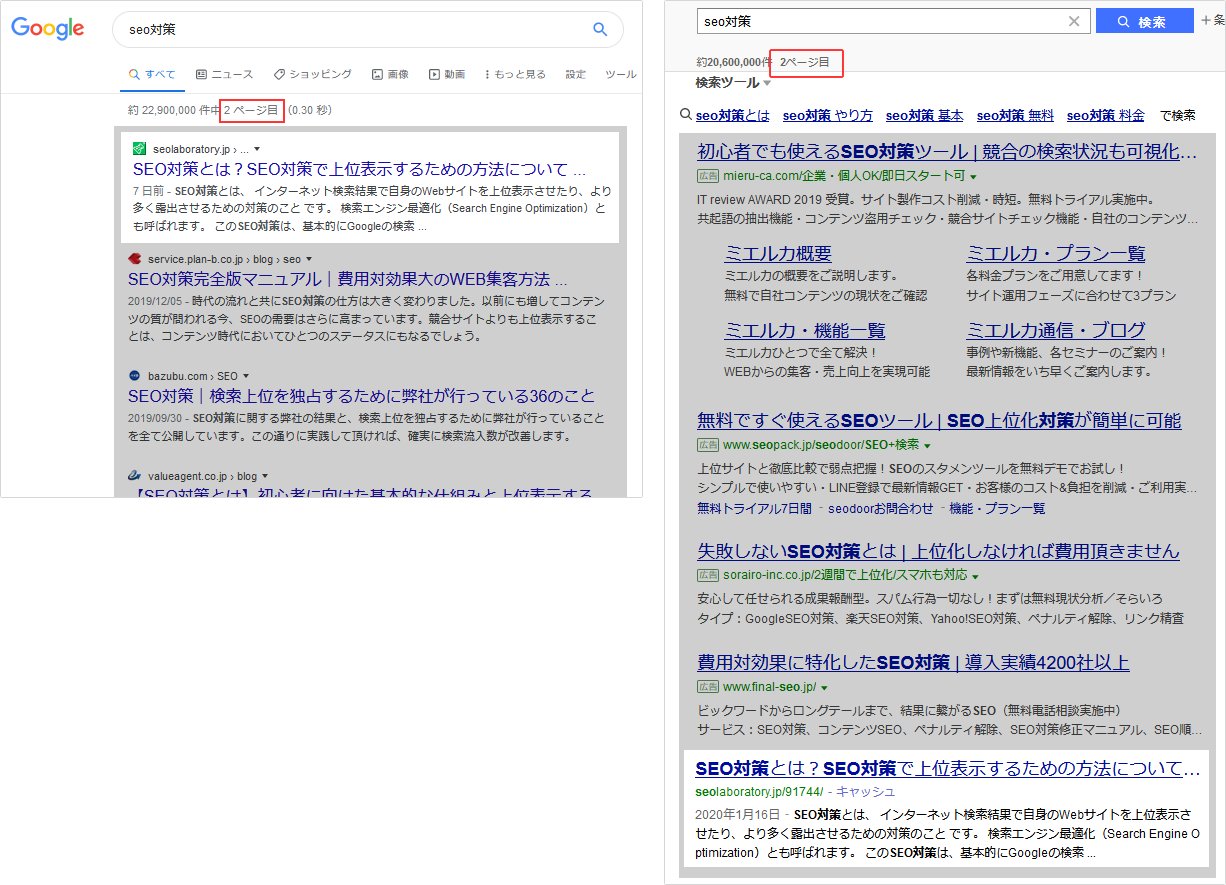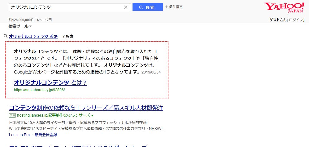 ・Yahoo、Biglobe、So-netなどGoogleから検索結果を購入している企業の場合、強調スニペットの機能が無いと初回から11位(2ページ目の1位)になっています。