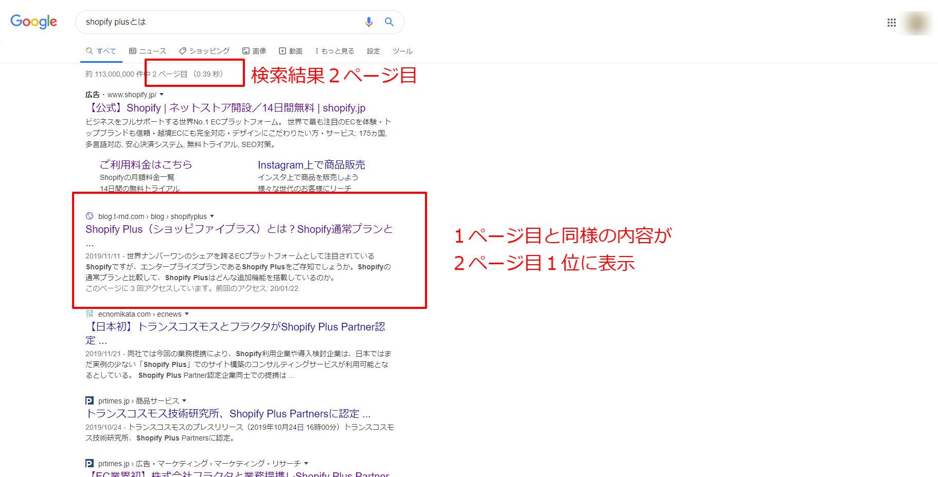 ・代わりに、強調スニペットに表示されたページは2ページ目の検索結果の1番目に表示される