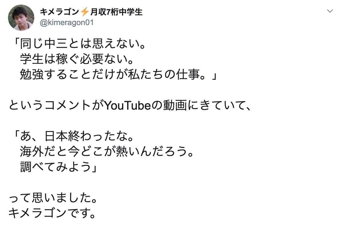 つい数日前に話題になった、月収6桁中学生のキメラゴンさん@kimeragon01 が秒速で月収7桁に….